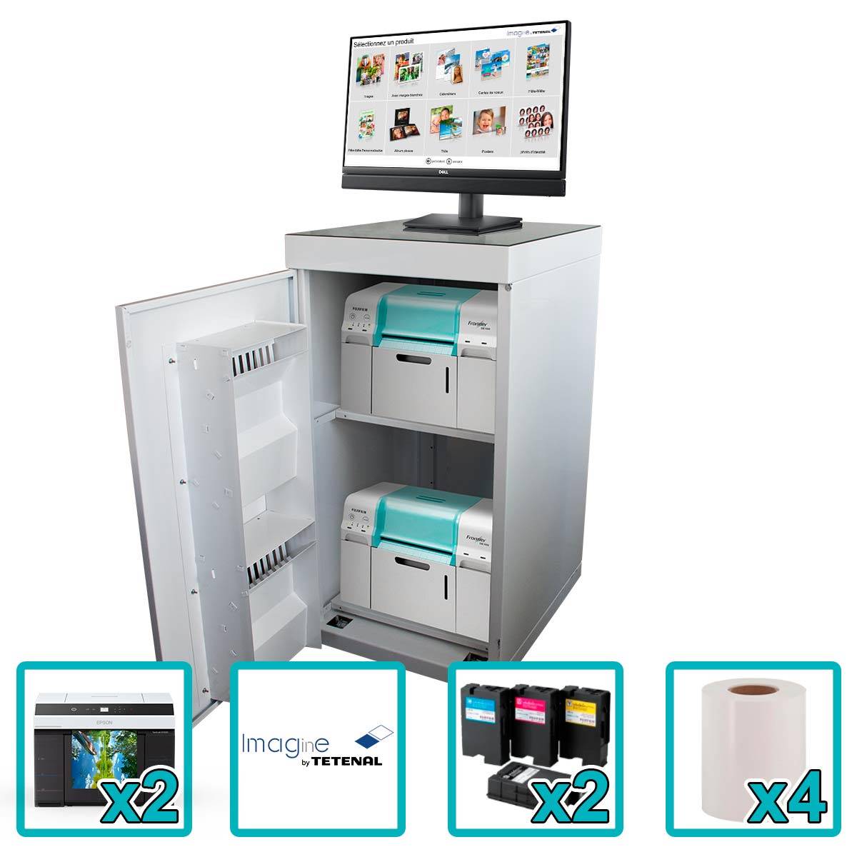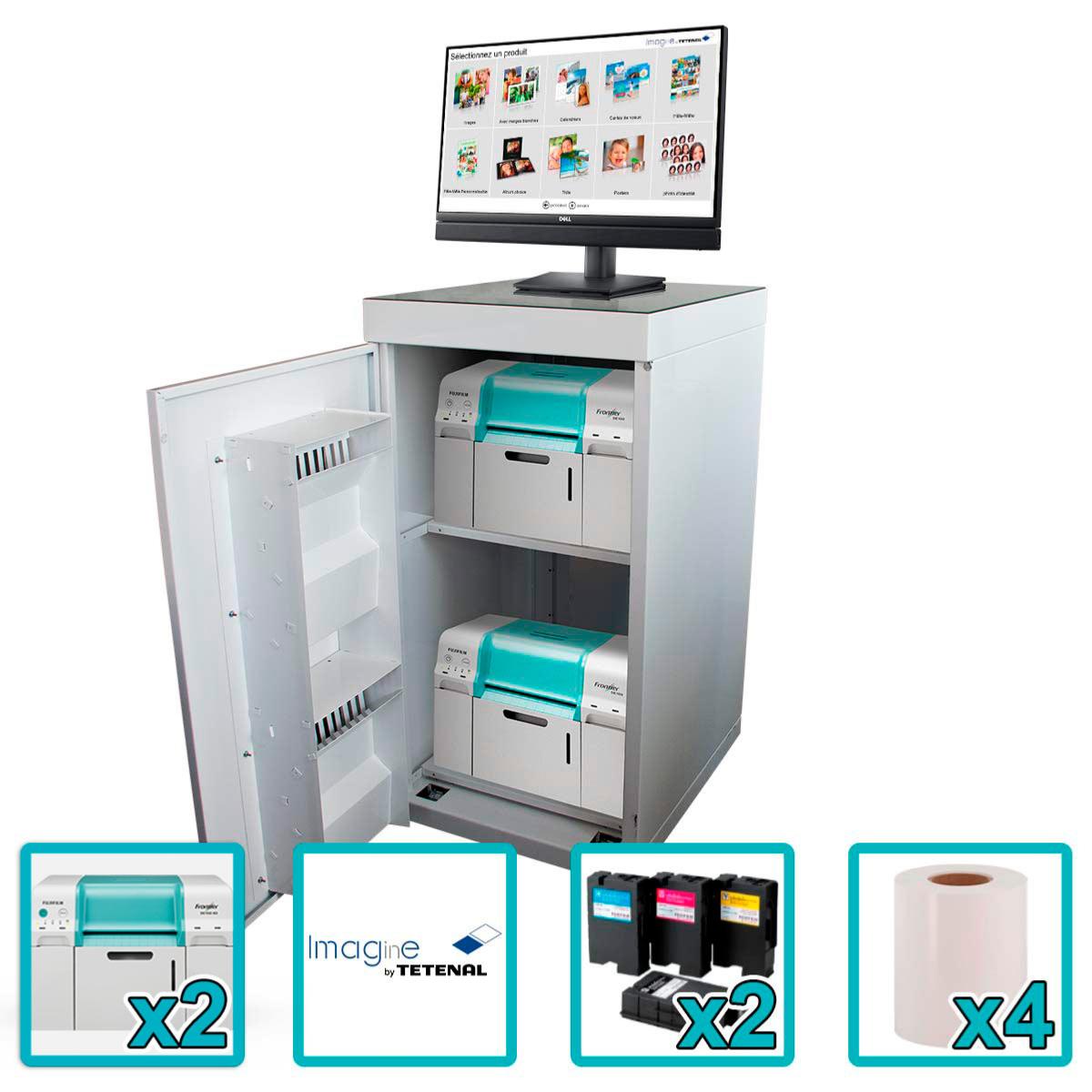 Station de prise de commande Imagine by Tetenal équipée de 2 imprimantes Fujifilm Frontier DE100-XD, spécialement conçue pour les magasins photo. Simple d'utilisation et intuitive, cette borne permet à vos clients de commander des tirages photos sur écran tactile. Comprend 2 jeu d'encres + 4 rouleaux de papier 152mm brillant.