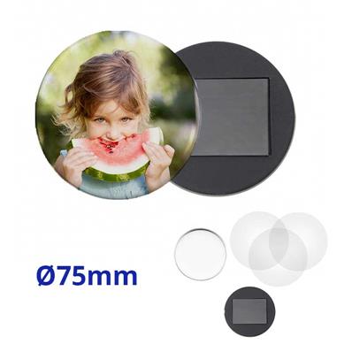 Badges magnet format 75 mm avec une finition professionnelle, à fabriquer vous-même, rapidement et simplement avec une machine à badges GAMAX B500/75.